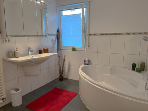 Das Esszimmer verfügt über einen gemütlichen runden Tisch an dem Sie mit Ihrer Familie und Freunden zusammen speisen können. Der Blick auf die Terrasse und ins Grüne gibt eine entspannte Atmosphäre.